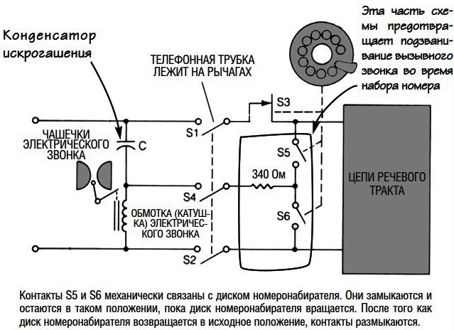 Таким образом, при повороте дискового номеронабирателя активируется встроенная система защиты, которая через замыкание контактов S5 и S6 автоматически шунтирует наиболее уязвимые элементы аппарата – голосовые цепи и цепь вызывного звонка. Этот продуманный электромеханический алгоритм обеспечивает надежную работу аппарата, защищая его компоненты от разрушительного воздействия собственных коммутационных импульсов и обеспечивая комфорт пользователя, изолируя его от неприятных акустических помех.