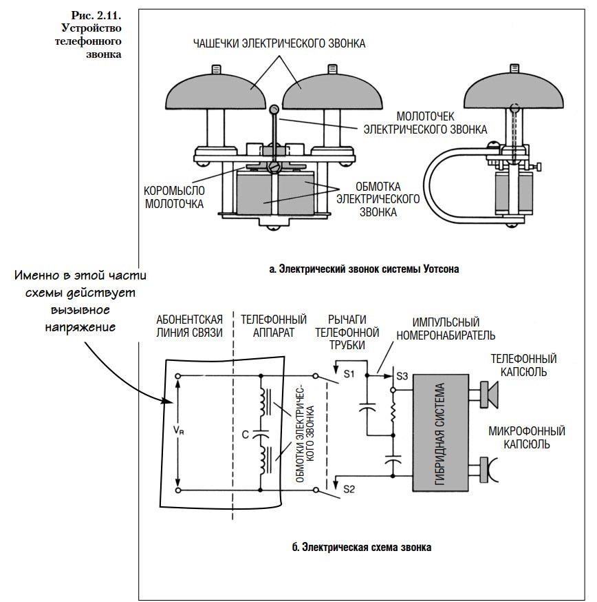 Электрическая схема и параметры вызывного сигнала. Упрощенная принципиальная схема цепи звонка представлена на рис. 2.11б. В данной схеме VR представляет собой звонковое напряжение, поступающее непосредственно с АТС. В США, например, стандартом является напряжение величиной около 90В среднеквадратического (эффективного) значения, при этом частота сигнала может варьироваться в диапазоне от 16 до 60 Гц. Именно это переменное напряжение вызывает протекание тока, который приводит весь механизм звонка в действие и обеспечивает генерацию звука.