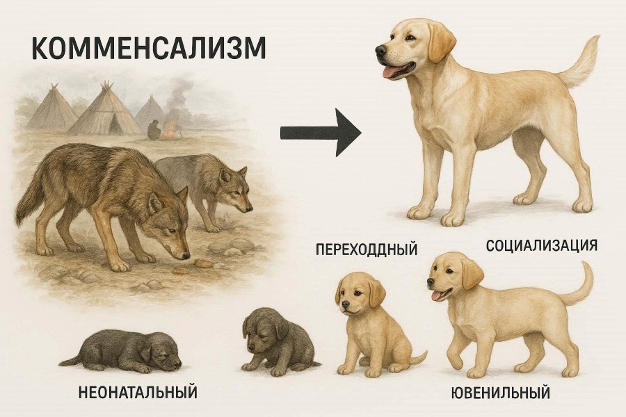 Происхождение домашней собаки (Canis lupus familiaris) является предметом активных научных дискуссий. Современная теория, поддерживаемая рядом исследователей, предполагает, что эволюция собак тесно связана с консументализмом – потреблением остатков человеческой пищи. Естественный отбор благоприятствовал особям, которые проявляли смелость и толерантность при приближении к человеческим поселениям. Важно отметить, что процесс одомашнивания не был результатом сознательного приручения волков человеком. Этот симбиоз возник естественным путем, как демонстрируют в своей работе Коопингер и Коопингер (2001).