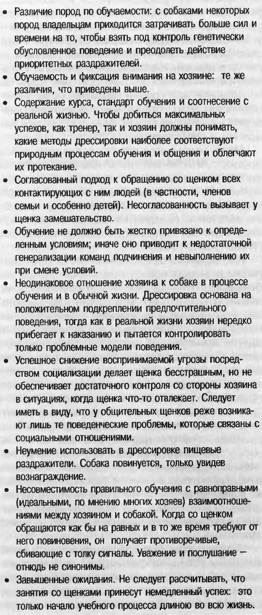 Эффективность занятий для щенков и роль вакцинации. Исследования эффективности занятий для щенков показывают неоднозначные результаты. Сравнивались группы, где проводилась только социализация, только дрессировка, и их комбинация. Максимальным достижением оказалось улучшение реакции на команды и предсказуемость поведения при встрече с новыми раздражителями. Многие переменные, отраженные на рис. 2.2, влияют на успех таких программ, и универсального решения не существует.