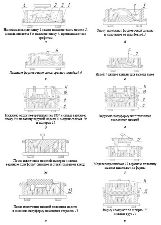 Завершение изготовления и сборка формы. Верхняя опока заполняется формовочной смесью и уплотняется, после чего излишки смеси срезаются (рис. 1.3, е). Далее производится удаление моделей стояков и выпоров, прорезается литниковая воронка и дополнительные вентиляционные каналы. После этого верхняя полуформа аккуратно снимается (рис. 1.3, ж), и из нее с помощью моделеподъемника (поз. 12) извлекается верхняя половина модели (рис. 1.3, з). На завершающем этапе изготовления в нижнюю полуформу устанавливается стержень (поз. 13 на рис. 1.3, и).