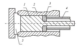 Обратное прессование: принцип работы и преимущества. Для уменьшения сил трения широко применяется метод обратного прессования (рис. 3.2). В данной схеме слиток 1 также помещается в контейнер 2, но с одной его стороны устанавливается глухая заглушка 5. При этом матрица 3 монтируется непосредственно на торце полого пуансона 4. В процессе деформации металл истекает в направлении, противоположном движению пуансона, через каналы в его теле. Ключевое преимущество этого способа заключается в том, что слиток не перемещается относительно контейнера, что радикально снижает трение.