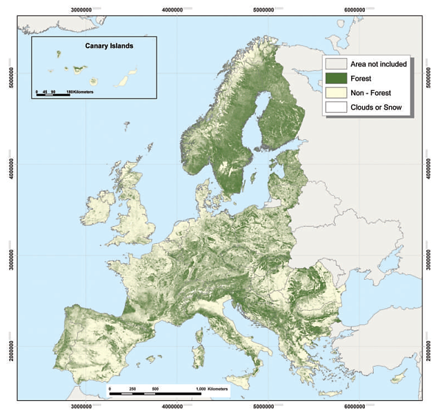 Введение в лесные экосистемы Европы. Лесные экосистемы представляют собой сложные и богатые видами наземные сообщества, существующие в разнообразных климатических, географических и экологических условиях. На европейском континенте общая площадь лесопокрытых земель достигает примерно 177 миллионов гектаров, что составляет около 42% его территории (рис. 3.4). Эти леса распределены по множеству растительных зон, простирающихся от прибрежных равнин до высокогорной альпийской зоны. Такое разнообразие подчеркивает глубокую взаимосвязь между абиотическими факторами и развитием лесных биоценозов, формируя уникальные экологические ниши.