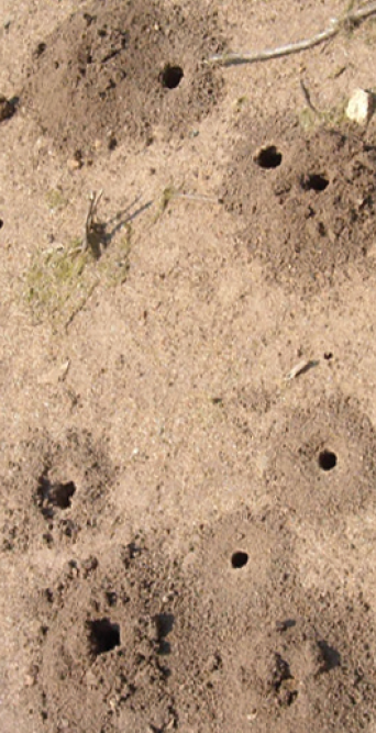 Рис. 3.29 наглядно демонстрирует входные отверстия подземных гнезд, созданных почвенными пчелами, с характерными холмиками грунта на поверхности. Пчелы, гнездящиеся в почве, к которым относятся как одиночные, так и общественные виды (например, шмели), являются одними из наиболее эффективных опылителей сельскохозяйственных культур. Ярким примером служит тыквенная пчела (Peponapis pruinosa), узкий специалист по опылению культур семейства тыквенных, которая устраивает гнезда непосредственно в земле (рис. 3.30). Эти пчелы предпочитают селиться на полях с оголенными, умеренно влажными, песчаными или суглинистыми почвами с теплой поверхностью, обычно избегая уплотненных и тяжелых грунтов.