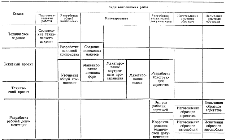 Стадия разработки рабочей документации. Следующая стадия — разработка рабочей документации — охватывает выпуск рабочих чертежей, технических условий, изготовление и испытание опытных образцов. На основе утвержденного технического проекта разрабатывается полный комплект рабочей технической документации, строго соответствующий требованиям ЕСКД (Единой системы конструкторской документации). Эта документация является руководством для изготовления опытных образцов автомобиля и в дальнейшем проходит цикл корректировок по результатам испытаний. Изготовление опытных образцов осуществляется по обходной технологии, но с безусловным соблюдением всех требований чертежей.