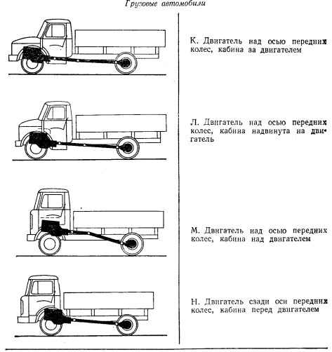 Компоновки грузовых автомобилей: К и Л (Классические). Схема К (двигатель над передней осью, кабина за двигателем) характеризуется большой базой и длиной, ограниченной обзорностью, но отличной доступностью к двигателю. Схема Л (кабина надвинута на двигатель) позволяет уменьшить габариты на 200–400 мм, но вызывает компоновочные сложности, ухудшает доступ к двигателю и повышает уровень шума в кабине. Для обеих схем распределение массы в нагруженном состоянии (27–30% на переднюю ось) является оптимальным для движения по плохим дорогам. Эти классические компоновочные схемы имеют преобладающее распространение на массовых автомобилях общего назначения любой грузоподъемности.