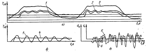 Рис. 10. Осциллограммы нагружения деталей автомобиля на переходных режимах: а - выезд из глубокой колеи методом «раскачки»; б — торможение трансмиссионным тормозом; е — движение по разбитой дороге; 1 и 2 — крутящие моменты соответственно на карданном валу и полуоси; 3 — перемещение педали сцепления; 4 —усилие на рычаге стояночного тормоза; 5 и 6 напряжение кручения и изгиба в коренном листе рессоры