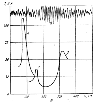Рис. 12. Изменение крутящего момента трансмиссии легкового автомобиля: a — одноузловая форма колебаний; б — амплитудно-частотная характеристика; 1 — резонансный пик с гармоникой i — 0,5; 2 и 3 резонансный пик трехузловых форм колебаний соответственно с гармониками i = 4,0 и i = 2,0