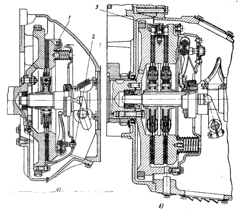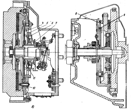 Рис. 24. Типовые конструкции дисковых сцеплений: 1 — упругие пластины; 2 — регулировочная гайка; 3 — механизм положения среднего диска; 4 — рычаги выключения; 5 — опорный фланец; 6 — коническая пружина; 7 — подвижная втулка; 8 — диафрагменная пружина; 9 — опорные проволочные кольца; 10 - пружина; 11 — шарики