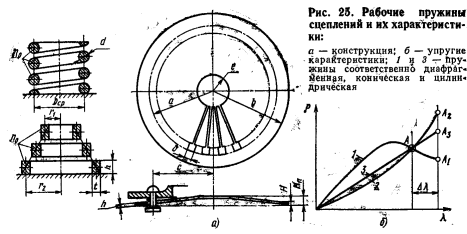 Сравнение сцеплений с разными типами пружин. Конструктивно сцепления различаются типом используемых нажимных пружин. В сцеплениях с периферийно расположенными цилиндрическими пружинами (рис. 24, а и б) при высоких оборотах возможно снижение нажимного усилия из-за действия центробежной силы, что приводит к пробуксовке и износу. Кроме того, в них сложно регулировать усилие, уменьшающееся при износе фрикционных накладок.