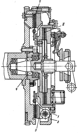 Рис. 27. Центробежное сцепление: I — для трогания; II — для переключения передач