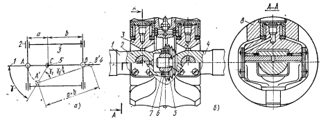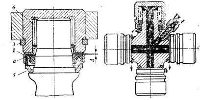 Для обеспечения синхронности при больших моментах применяются сдвоенные карданные шарниры, состоящие из двух асинхронных шарниров и центрирующего устройства (Рис. 88). Синхронность достигается при равенстве углов и расположении вилок в одной плоскости, что обеспечивается центрирующим устройством с сферическим сухарем и обоймой. Недостатками являются большие габариты, сложность и ненадежность уплотнений.