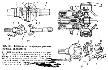 Карданные шарниры равных угловых скоростей (ШРУСы) (Рис. 86) широко используются в приводах ведущих управляемых колес, обеспечивая равномерное вращение при больших углах. Наиболее распространены шариковый шарнир с делительными канавками (Рис. 86, а) и шарнир с делительным рычажком (Рис. 86, б). В обоих типах центры шариков расположены в биссекторной плоскости, что гарантирует равенство угловых скоростей.