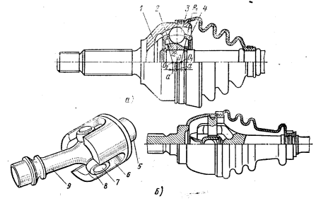 Рис. 87. Шариковые шарниры: а — со смещенными центрами канавок; б - с тремя шипами; 1 и 2 — наружная и внутренняя сферические обоймы; 3 — шарики; 4 — сепаратор; 5 и 9 — валы карданного сочленения; 6 - цилиндрические канавки; 7 — шипы; 8 — сферические ролики