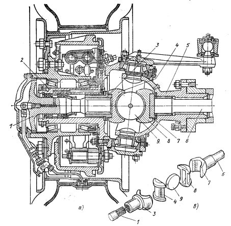 Рис. 89. Привод переднего колеса автомобиля с кулачковым карданным шарниром: а — общий вид; 6 — детали кулачкового шарнира; 1 и 6 — полуоси; 2 — поворотная цапфа; 3 и 7 — вилки; 4 и 8 — кулачки; 5 — шаровая опора; 9 — диск