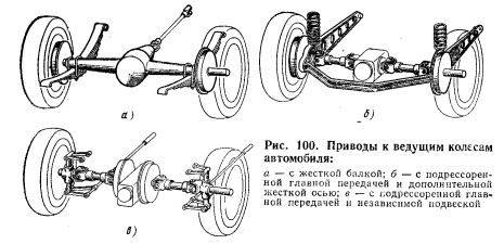 Главная передача в совокупности с дифференциалом и полуосями формирует ключевой узел трансмиссии, отвечающий за привод ведущих колес. Конструктивная схема данного узла напрямую зависит от типа направляющего устройства подвески, что наглядно проиллюстрировано на Рис. 100. В случае применения цельной балки моста (Рис. 100, а) картер главной передачи может жестко крепиться к балке или быть ее составной частью. В такой конструкции полуоси представляют собой валы, которые могут быть полностью или частично разгружены от действия поперечных сил.