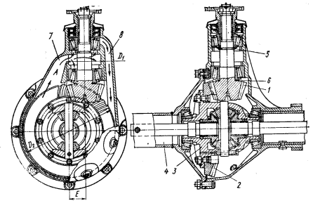 Рис. 101. Одинарная гипоидная главная передача: 1 — шестерня; 2 — колесо; 3 — дифференциал; 4 — полуось; 5 и 6 — соответственно регулировочные кольцо и прокладки; 7 и 8 — каналы соответственно подвода масла к подшипникам и отвода масла от сальников; 9 — гипоидное смещение