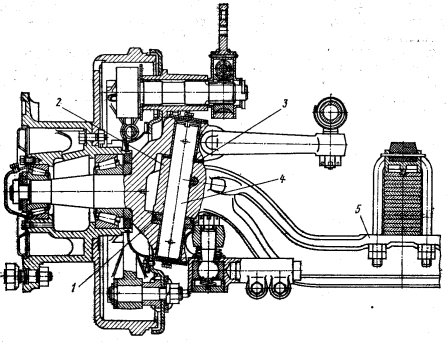 Рис. 132. Управляемый мост: 1 — опорный подшипник поворотного кулака; 2 — бобышка балки; 3 — регулировочные прокладки; 4 — шкворень; 5 — площадка крепления рессоры