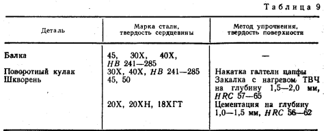 Материалы для изготовления основных деталей управляемого моста. Выбор материалов для деталей управляемого моста регламентируется высокими требованиями к прочности и износостойкости, особенно для узлов трения. Согласно данным таблицы 9, для изготовления балки применяются стали марок 45, 30Х, 40Х с твердостью сердцевины НВ 241—285. Поворотный кулак, испытывающий значительные циклические нагрузки, производится из сталей 30Х или 40Х и часто дополнительно упрочняется методом накатки галтели цапфы.