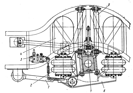 Рис. 142. Зависимая пневматическая балонная подвеска ведущих колес автобуса ЛАЗ-699: 1 - тяга; 2 — баллон; 3 — регулятор; 4 — резервуар; 5 — амортизатор; 6 — балка; 7 - буфер отбоя