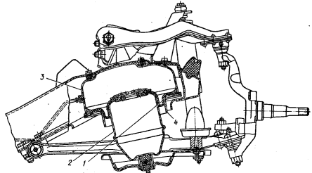 Рис. 143. Передняя пневматическая подвеска автомобиля с диафрагменным упругим элементом: 1 — резинокордная диафрагма; 2 — поршень; 3 — корпус; 4 — направляющая