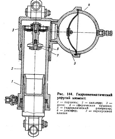 Отдельного внимания заслуживают телескопические гидропневматические упругие элементы. В них усилие от сжатого газа передается через жидкость, что позволяет объединить в одном агрегате упругий элемент, ограничитель хода и гидравлический амортизатор. На рис. 144 показано, как при движении колеса вверх поршень (1) вытесняет жидкость из цилиндра (2) в гидропневматический резервуар (5).