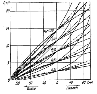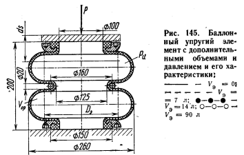 На рис. 145 и рис. 146 приведены характеристики баллонного и диафрагменного упругих элементов, демонстрирующие их поведение при различных объемах и давлениях. Эти графики позволяют инженерам выбрать необходимый упругий элемент в соответствии с заданными требованиями к характеристикам подвески. Анализ показывает, что баллонные упругие элементы имеют ограничение по снижению собственной частоты подвески (1–1,3 с⁻¹) и часто требуют применения объемных дополнительных резервуаров.