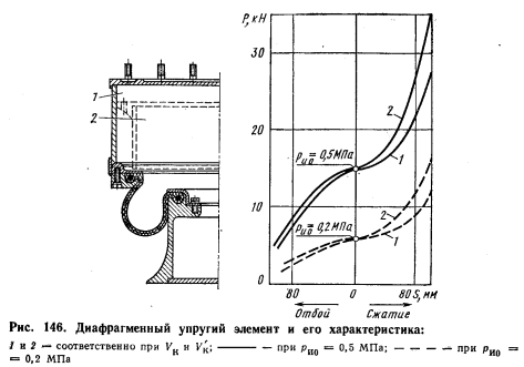 В отличие от них, диафрагменные упругие элементы способны обеспечивать более низкую собственную частоту колебаний, что напрямую улучшает плавность хода. Благодаря этому они нашли широкое применение на легковых автомобилях и автобусах. Рис. 146 иллюстрирует конструкцию и характеристики такого элемента, где разность объемов Vк и V’к составляет 3 литра. Однако, по сравнению с баллонными, диафрагменные элементы обладают и рядом недостатков.