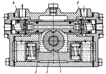 Рис. 147. Регулятор положения кузова с гидравлическим замедлителем: 1 — шестерня; 2 — амортизирующее устройство; 3 — толкатель; 4 и 5 — клапаны; 6 - клапан регулировочного винта