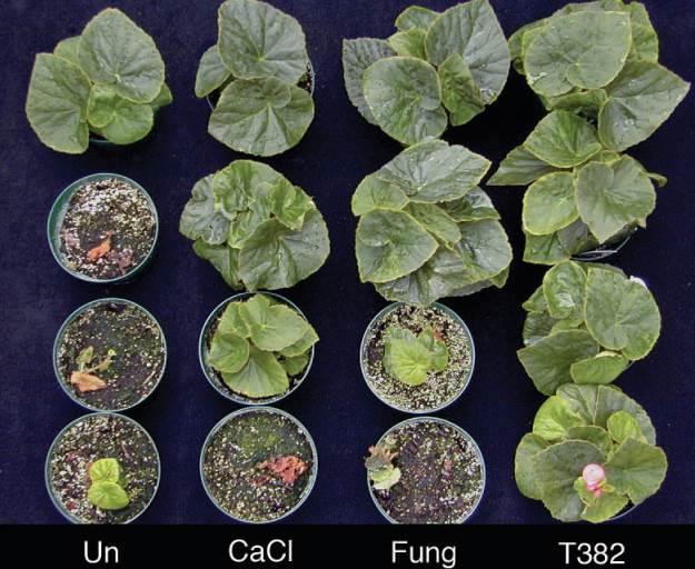 На рисунке 4.22 представлен пример биоанализа, демонстрирующий эффективность системы биоконтроля против патогена растений Botrytis cinerea. В эксперименте бегонии выращивали в оптимальных для развития патогена тепличных условиях. Результаты обработок расположены слева направо по возрастанию эффективности: необработанный контроль (Un), хлорид кальция (CaCl), стандартный фунгицид (Fung) и средство биоконтроля на основе гриба Trichoderma hamatum (штамм T382). Наилучший результат показал именно биоконтроль: растения, обработанные антогонистическим грибком, продемонстрировали максимальное развитие листвы, будучи защищенными от патогена.