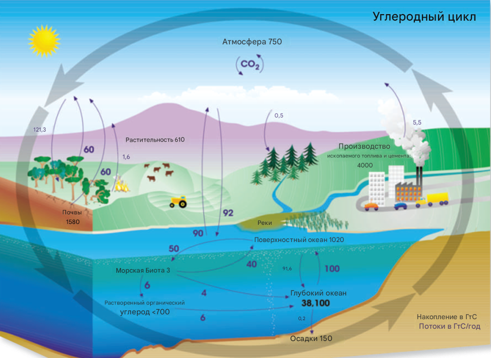 Рис. 5.19: Схема глобального углеродного цикла. Черные цифры обозначают запасы углерода в различных резервуарах в гигатоннах (ГтC), фиолетовые — ежегодные потоки между ними. Данные приблизительно соответствуют 2004 году. Отложения на схеме не включают ~70 млн Гт углерода в карбонатных породах и керогене.