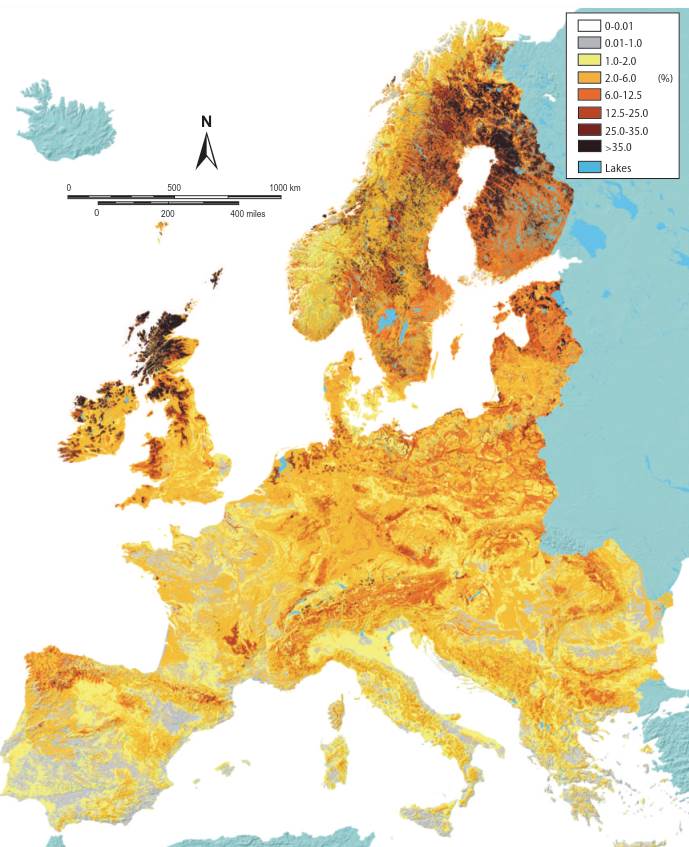 Рис. 5.21: Карта распределения запасов органического углерода в почвах Европы.