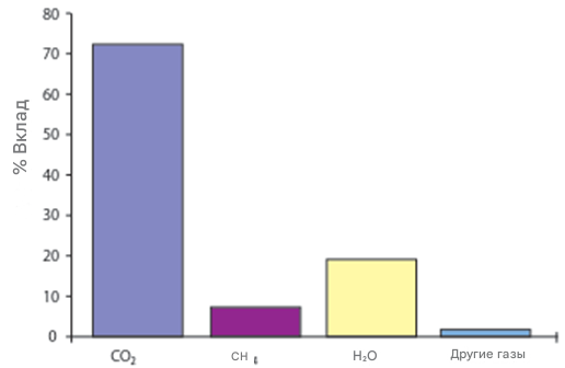 Рис. 5.20б: Сравнительный вклад различных парниковых газов (CO₂, CH₄, N₂O) от природных и антропогенных источников в изменение климата. Потенциал глобального потепления (ПГП) указан относительно CO₂.