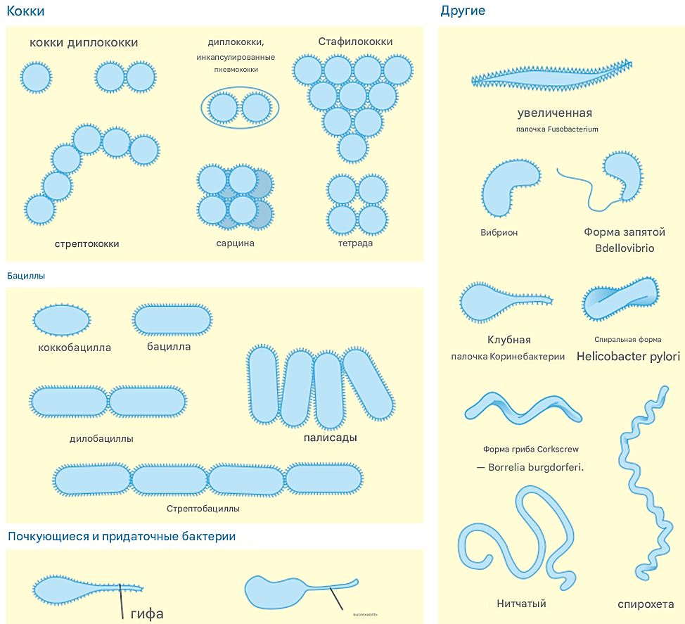 Рис. 1.1: Различные формы прокариотических клеток, которые можно увидеть под микроскопом