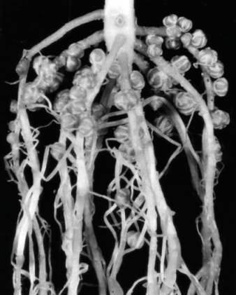 Рис. I.III: Корневые клубеньки, образующиеся у Rhizobium sp. на корнях бобовых растений как часть симбиотических отношений между бактерией и растением. Растение обеспечивает безопасную среду обитания, богатую сахарами в качестве пищи для бактерий, которые, в свою очередь, преобразуют азот в пригодные для растений формы