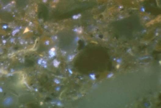 Рис. I.IV: Колонии бактерий на изображении выше окрашены в синий цвет и разбросаны по всему этому тонкому участку почвы