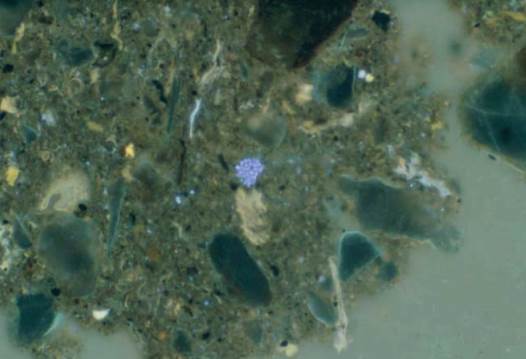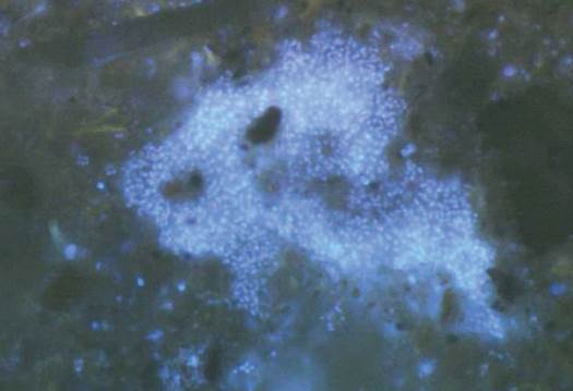 Рис. I.V: Колония бактерий, окрашенная в синий цвет, растущая в очень ограниченном поровом пространстве