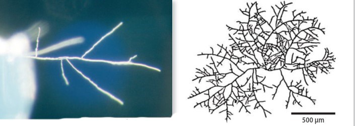 Рис. III.I: Схематическое изображение грибных гиф в разных масштабах: ветвление гифы (слева) и разросшийся мицелий, сформированный гифами (справа).
