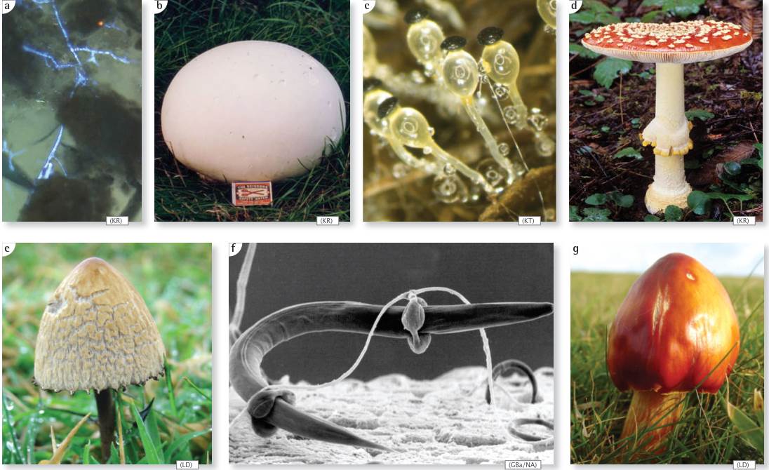 Рис. III.III: Структурное разнообразие грибов: (а) микрофотоснимок гиф (синий цвет), растущих сквозь почвенные поры; (b) плодовое тело дождевика гигантского (Calvatia gigantea), содержащее споры; (c) спорангии Pilobolus sp., демонстрирующие рекордное ускорение при выбросе спор; (d) плодовое тело мухомора (Amanita muscaria); (e) плодовое тело Lacrymaria sp.; (f) хищный гриб Drechslerella anchonia с ловчими кольцами для нематод; (g) плодовое тело Hygrocybe punicea.