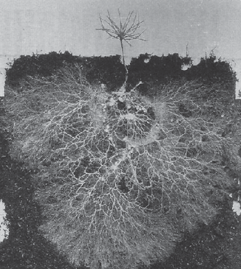 Рис. III.IV: Грибной мицелий, образующий микоризную связь с корнями растения. Белые структуры — преимущественно гифы гриба.