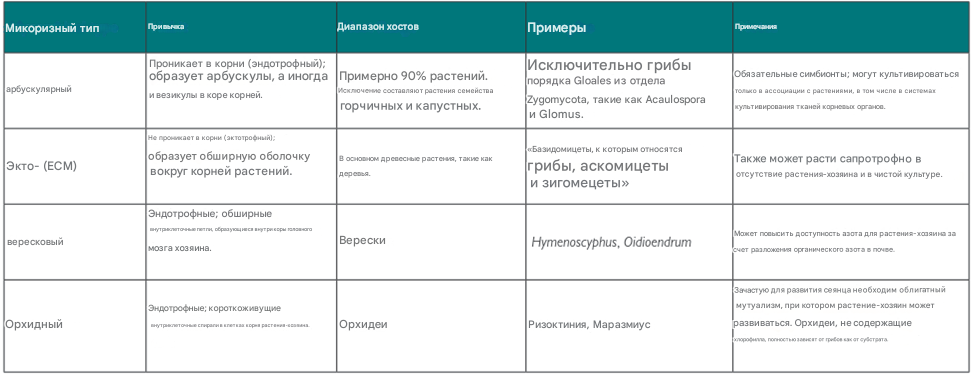 Таблица III.I: Основные характеристики четырёх типов микоризы (по данным Ritz, 2005).