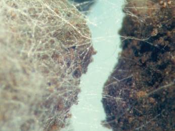 Рис. III.V: Грибные гифы, спутывающие два почвенных агрегата и заполняющие поровое пространство между ними.