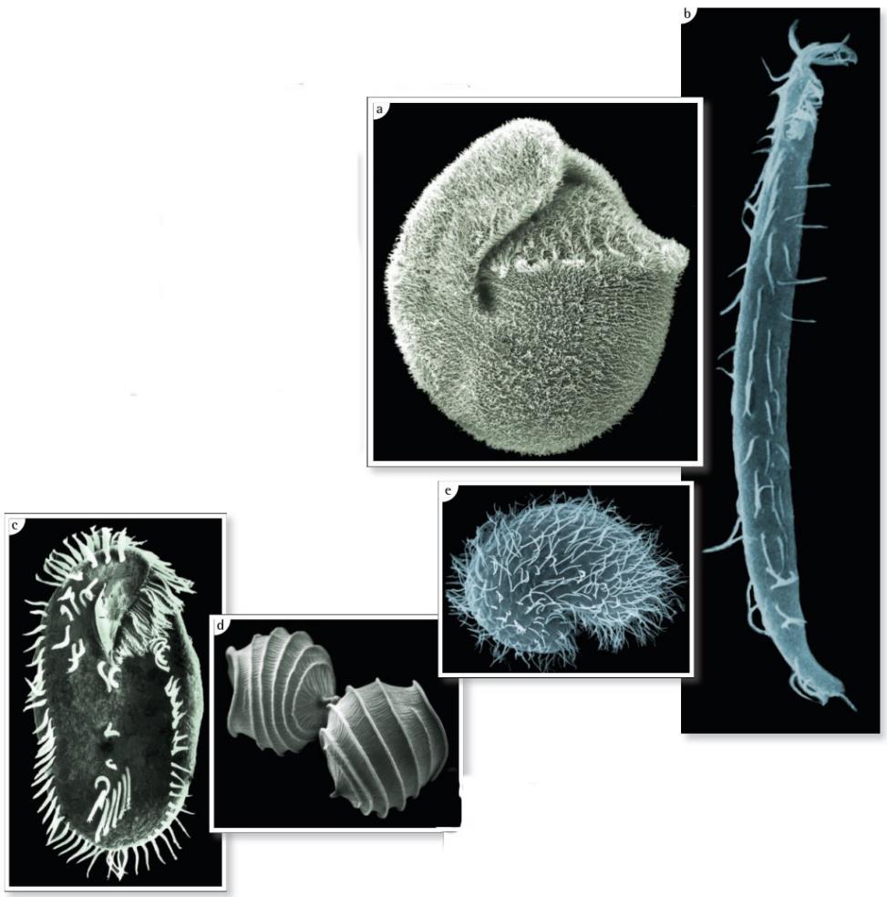 Рис. V.II: Сканирующие электронные микрофотографии почвенных инфузорий: (a) микофаг Bresslauides discoideus; (b) стройная Engelmanniella sp.; (c) крупная Pattersoniella vitiphila; (d) сидячий хищник Paracineta lauterborn; (e) типичный представитель рода Colpoda, давшего название сообществу почвенных инфузорий Colpodetea.