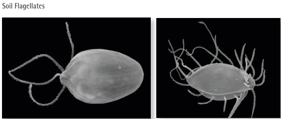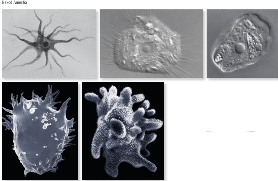 Рис. V.III: Голые амёбы (световая и сканирующая электронная микроскопия). Размер от 10 до 100 мкм. Особи с тонкими псевдоподиями осваивают мелкие поры, питаясь бактериями; формы с толстыми лобоподиями потребляют споры грибов и инфузорий. Численность может достигать 40 000 клеток на грамм почвы.