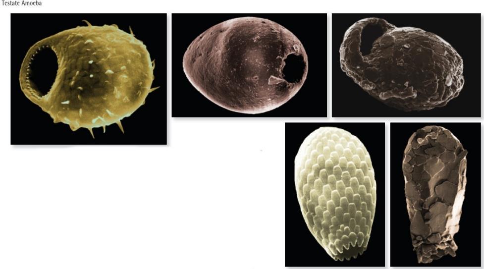 Рис. V.IV: Раковинные (тестатные) амёбы. Раковина состоит из секретируемых кремнистых пластин (Corythion asperulum, Euglypha) или агглютинированных минеральных частиц (Pseudawerintzewia orbistoma, Difflugia lucida). Устье (псевдостома) часто миниатюрно для снижения потерь воды. Численность — до 20 000 клеток/г, важные биоиндикаторы.