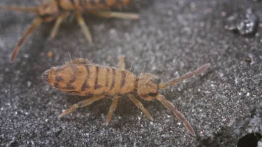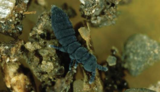 Рис. IX.III: Entomobrya nivalis – поверхностная коллембола, обитающая на почве и растительности. Особи достигают 1-2 мм в длину, имеют глобальное распространение, часто встречаются на травах и кустарниках и отличаются относительно высокой устойчивостью к высыханию.