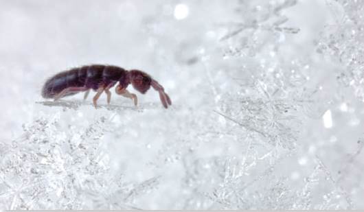 Рис. IX.II: Desoria sp. Некоторые коллемболы, такие как Hypogastrura harveyi и H. nivicola, известны как «снежные блохи». В тёплые дни их можно наблюдать прыгающими по снегу, как показано на примере Desoria sp. Это не блохи, а коллемболы, чья способность выживать и перемещаться по снегу подчёркивает их выдающуюся адаптивность, позволившую колонизировать практически все наземные экосистемы.