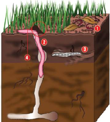 Рис. XIII.I: Пространственное распределение трех экологических групп дождевых червей. 1 = эпигейный вид, 2 = анецический вид, 3 = эндогейный вид и 4 = отложения (копролиты) на поверхности почвы.