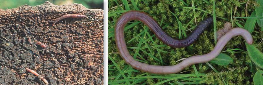 Рис. XIII.II: На фотографии слева изображен эпигейный вид Allolobophoridella eiseni, обитающий в листовой подстилке и слое мульчи. Справа изображен Aporrectodea giardi — представитель анецической группы. Фотографии предоставлены: слева (MBo), справа (автор).