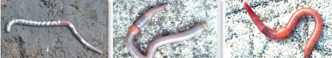 Рис. XIII.III: Морфологическое разнообразие эндогейных дождевых червей (слева направо): Aporrectodea icterica, Octolasium cyaneum, Allolobophora chlorotica. Несмотря на принадлежность к одной экологической группе, виды различаются по пигментации, размеру, форме и положению клителлюма.